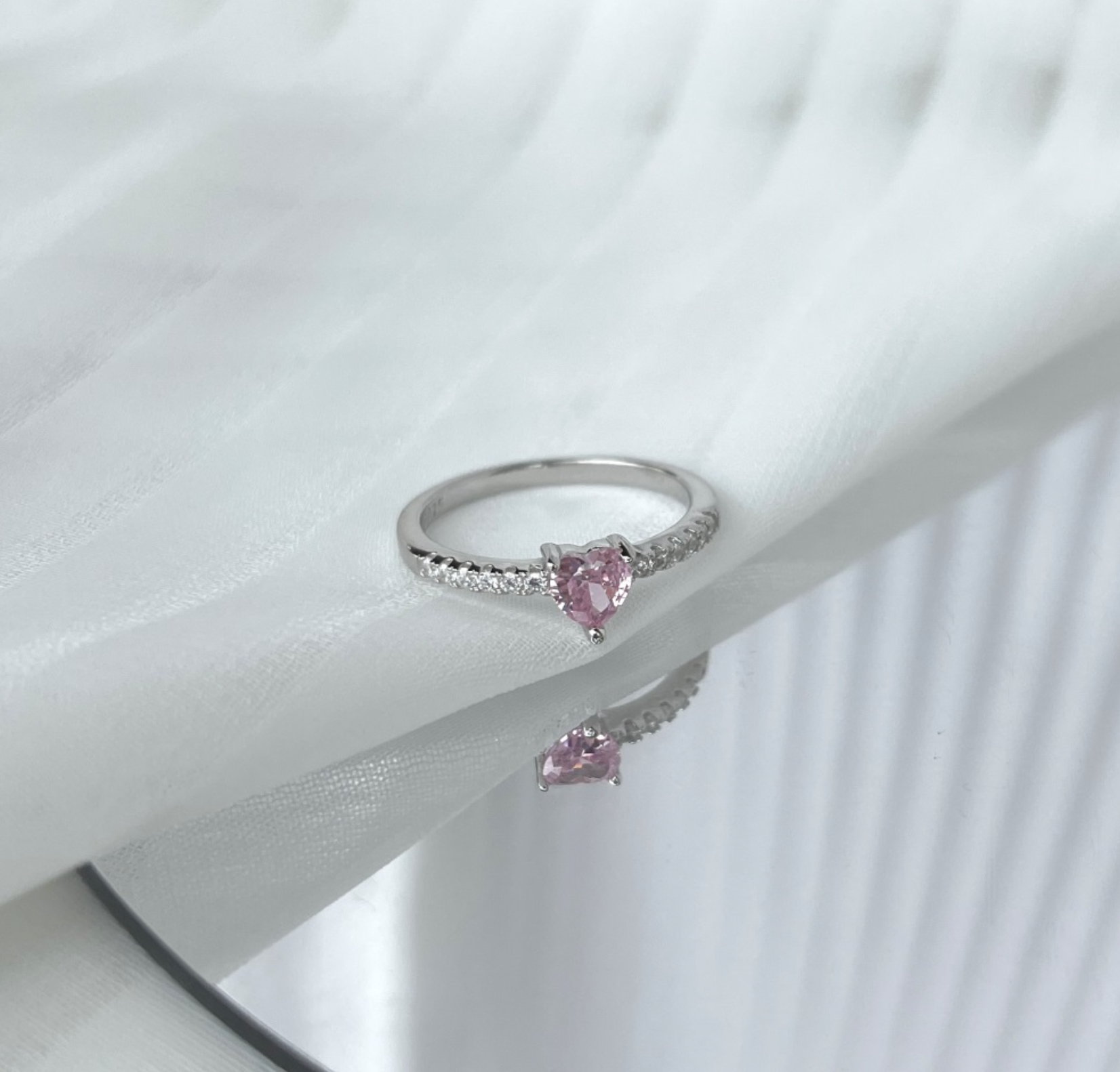 The centerpiece is a 5 × 5 mm heart-cut cubic zirconia, delivering a 0.50 carat look with a soft pink glow. Accented by 12 small pavé-set stones along the band, the design adds subtle brilliance without overwhelming its delicate silhouette.